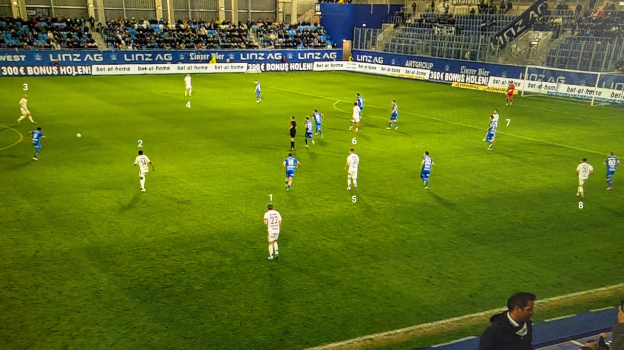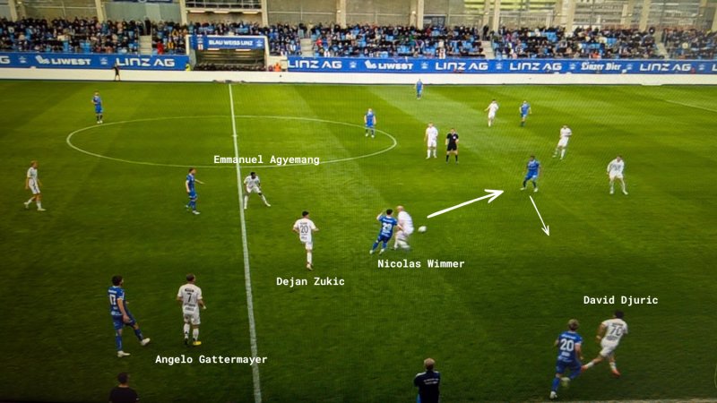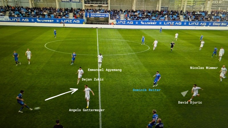 Blau-Weiß Linz spielt durch den eher laschen Druck der ersten WAC-Linie, Nicolas Wimmer rückt zu spät aus der Fünferkette. Nach einem Doppelpass mit Ronivaldo hat Dominik Reiter in der Vorwärtsbewegung viel Platz, trifft letztlich aber keine gute Entscheidung.