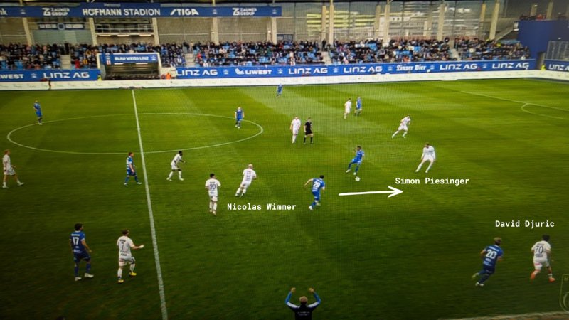 Das erste Tor von Blau-Weiß Linz ist dafür ein gutes Beispiel: Innenverteidiger Dominik Baumgartner setzt sich mit einem schlechten Defensivkopfball nach oben zuerst selbst unter Druck und geht dann im Duell mit Shon Weissmann leicht zu Boden - der Israeli kann den Ball annehmen und nach einer Drehung aus kurzer Distanz einschieben.