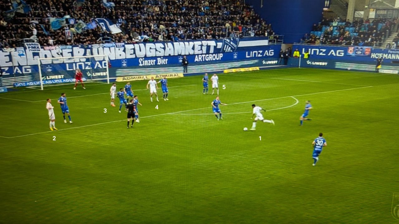 Ähnlich agiert die Elf aus Kärnten auch in anderen Situationen. Der Freistoß zum 2:0 entsteht aus einem Fehlpass im Spielaufbau, im Anschluss verhalten sich die drei Innenverteidiger ungeschickt. Mit schnellen Doppelpässen und Diagonalbällen war der WAC am Dienstag defensiv permanent überfordert.