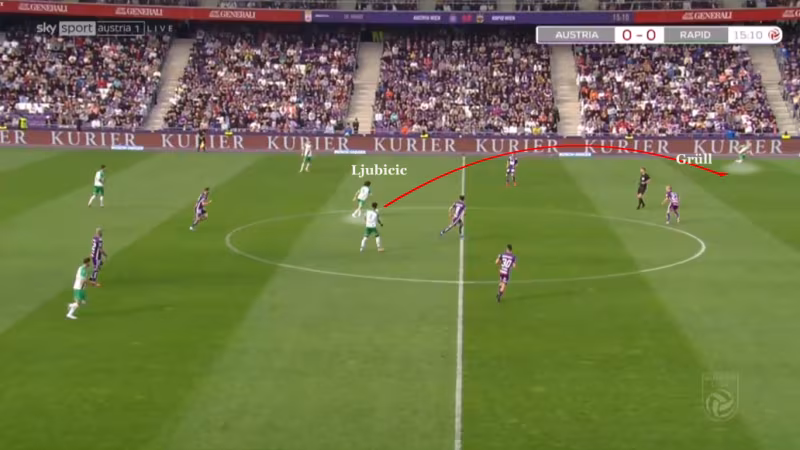 Durch das Herausattackieren von Grünwald konnte die erste Pressinglinie der Austria mit einem vertikalen Pass auf den Sechser sofort überspielt werden. Emanuel Aiwu spielte den Pass direkt auf Robert Ljubicic, der diese Aktion perfekt ausführte. Nicht nur machte er Schulterblicke zu den richtigen Zeitpunkten – also kurz vor dem Pass und während der Ball unterwegs ist – sondern nahm den Ball auch so mit, dass er mit dem zweiten Kontakt den hohen diagonalen Pass auf Marco Grüll spielen kann. Dabei war es natürlich auch wichtig, dass Aiwu den direkten Pass auf den linken Fuß von seinem Mitspieler spielt, sonst könnte sich Ljubicic nicht ohne Probleme nach vorne aufdrehen. Ein weiteres Beispiel für die Seitenverlagerung von Rapid. (Abbildung 5)